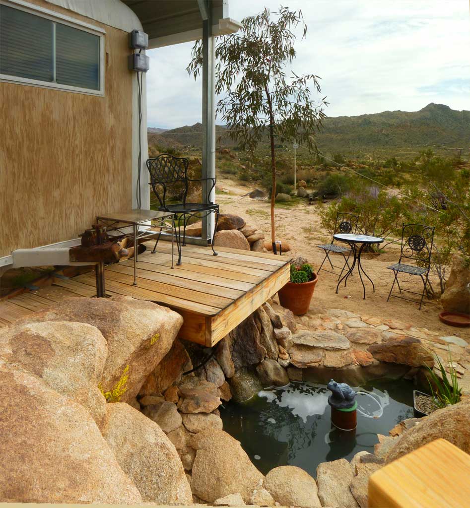 A patio pond with a frog spitter that refills the pond after the tree water is pumped out-
