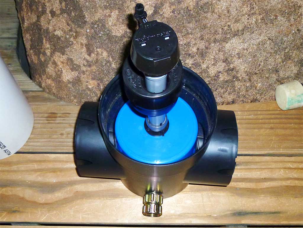 The basic pond filler- a toilet valve in a closed container, connected to a garden hose