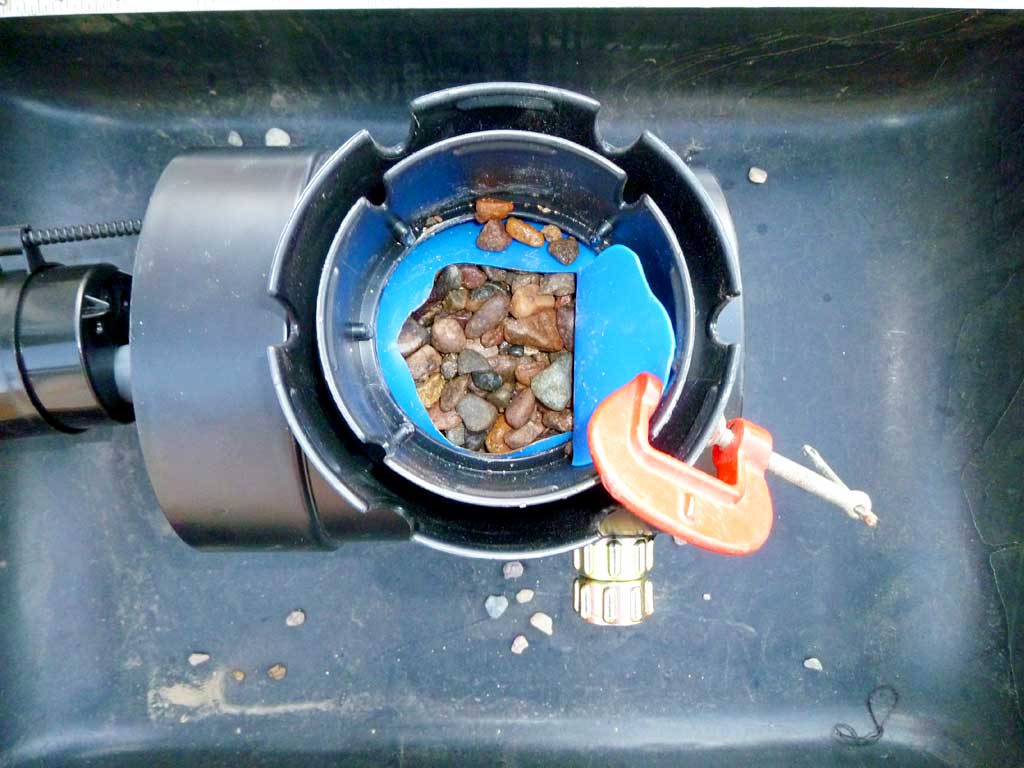 The base of the pond filler is filled with ballast to keep it from tipping over