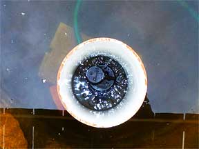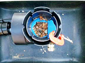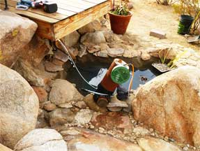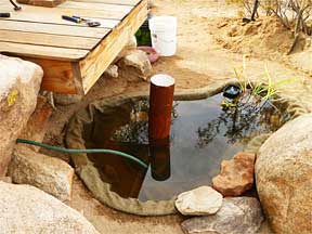 The working mechanism is intentionally enclosed within a tight and filtered PVC chamber. It only receives clear fresh water from the water source. If it were exposed to the pond water, it could accumulate a sludge over time within the mechanism, and debris, that would eventually stop it from functioning. Likewise, the surrounding 6" PVC pipe and lid is opaque so that the sun cannot encourage algea to grow within the works. Though the loss of the frog has exposed the screened grating in the lid, hopefully the grates will not allow too much sunlight to pass through. We will see.