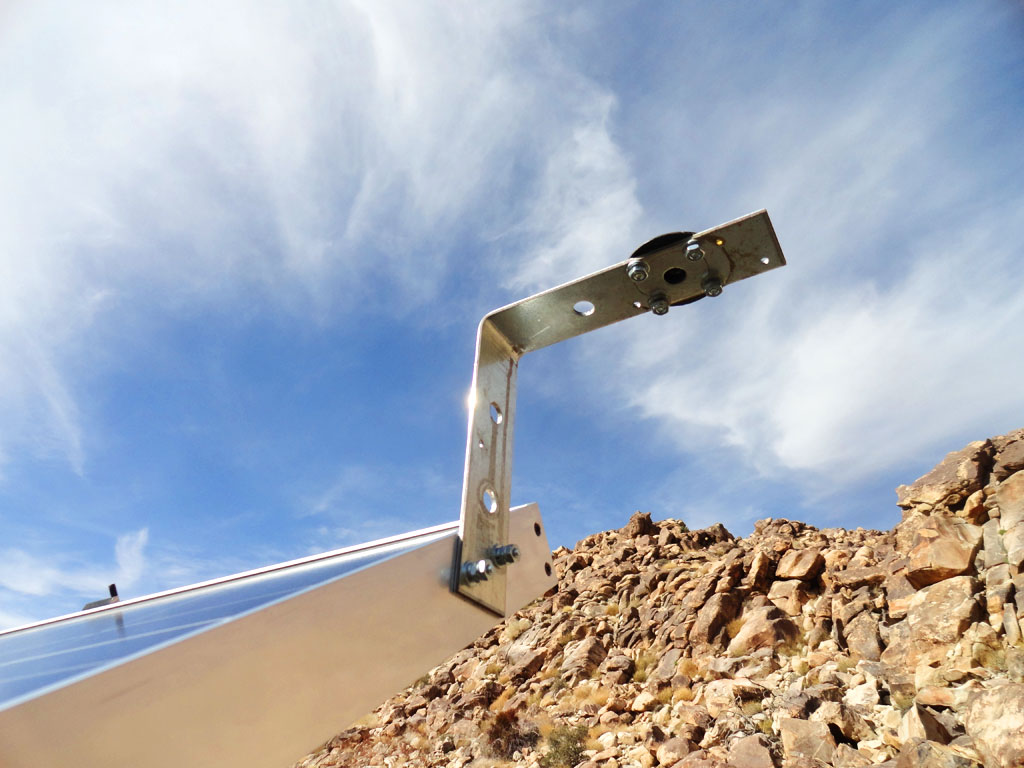 A custom made roof mount for a Logitech Alert 750e attached to the highest corner of our solar array