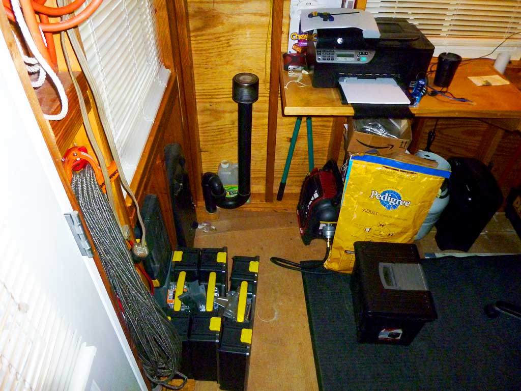 2011: Three plastic Stanley organizers bought at Home Depot for storing scattered boxes and jars of screws and bolts, etc.