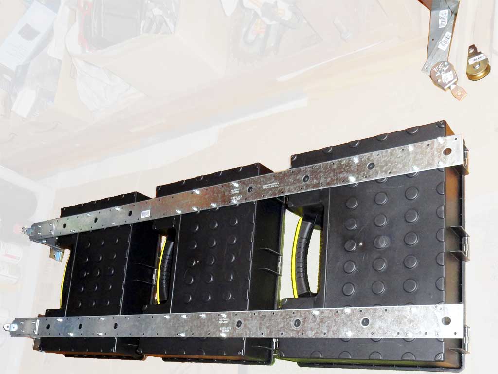 2011: Three plastic Stanley organizers bolted to steel straps with hinges for storing scattered boxes and jars of screws and bolts, etc.