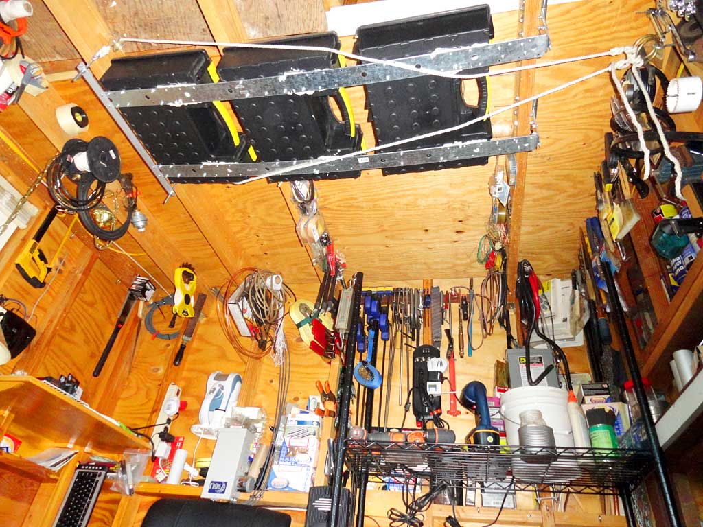 2011: Three plastic Stanley organizers bolted and glued to steel straps hinged to rafters with ropes and pulleys
