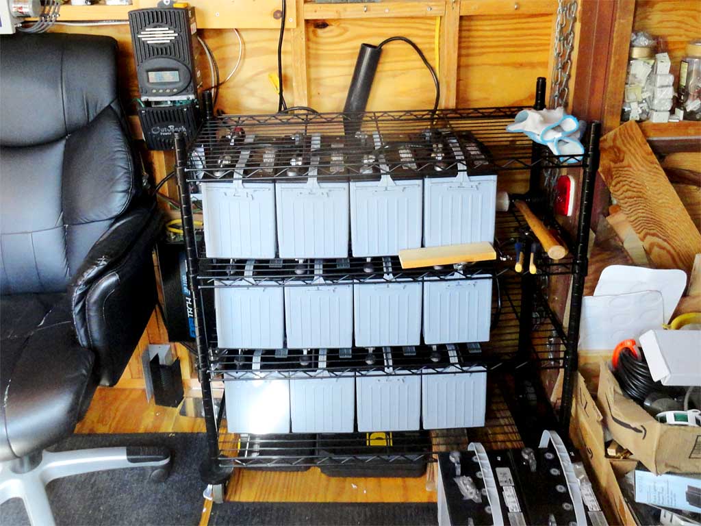 Twelve B-DK-8A27 Deka AGM 12V deep cycle batteries go live as three parallel 48V banks. 2018: I have come to learn that expensive batteries are a waste of money. The 16 golf cart batteries I use now last just as long. |