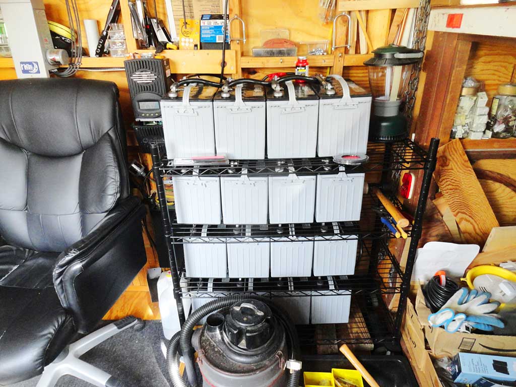 Sixteen B-DK-8A27 Deka AGM 12V deep cycle batteries become four parallel 48V banks.