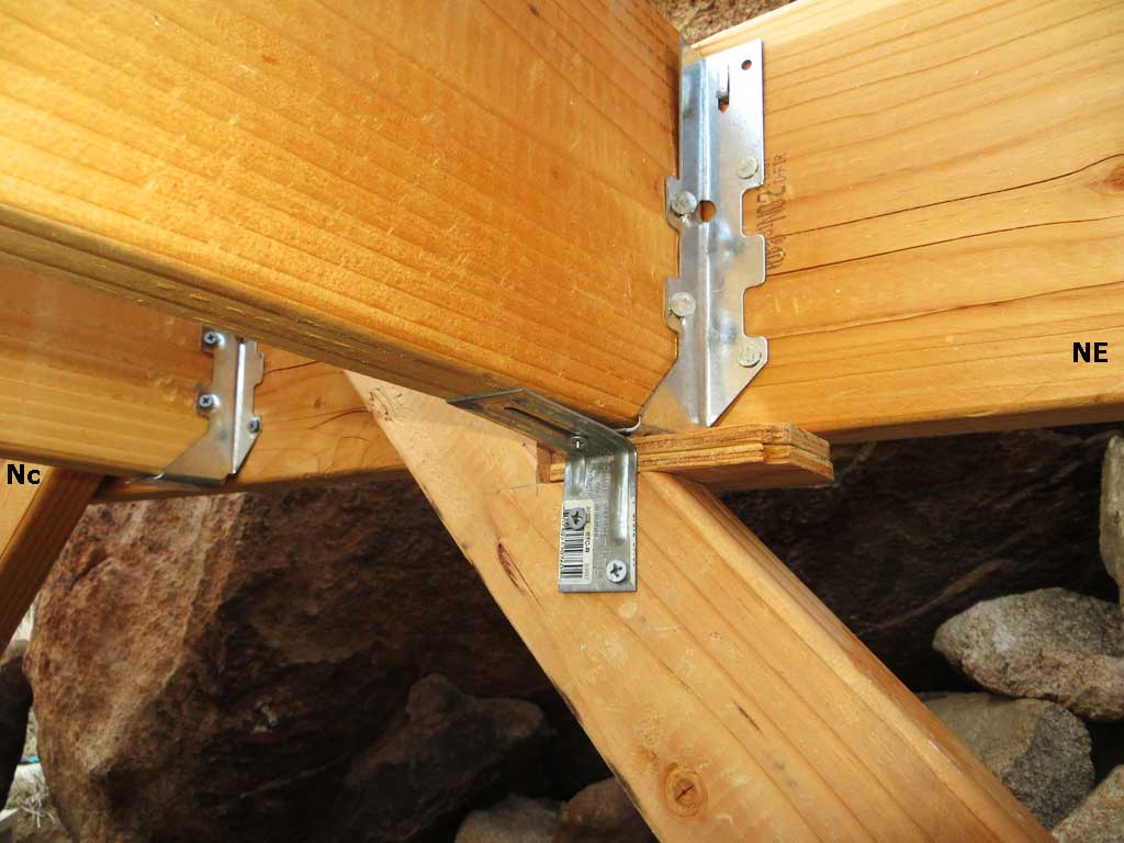 shed platform post braces are notched to fit, shimmed and reinforced