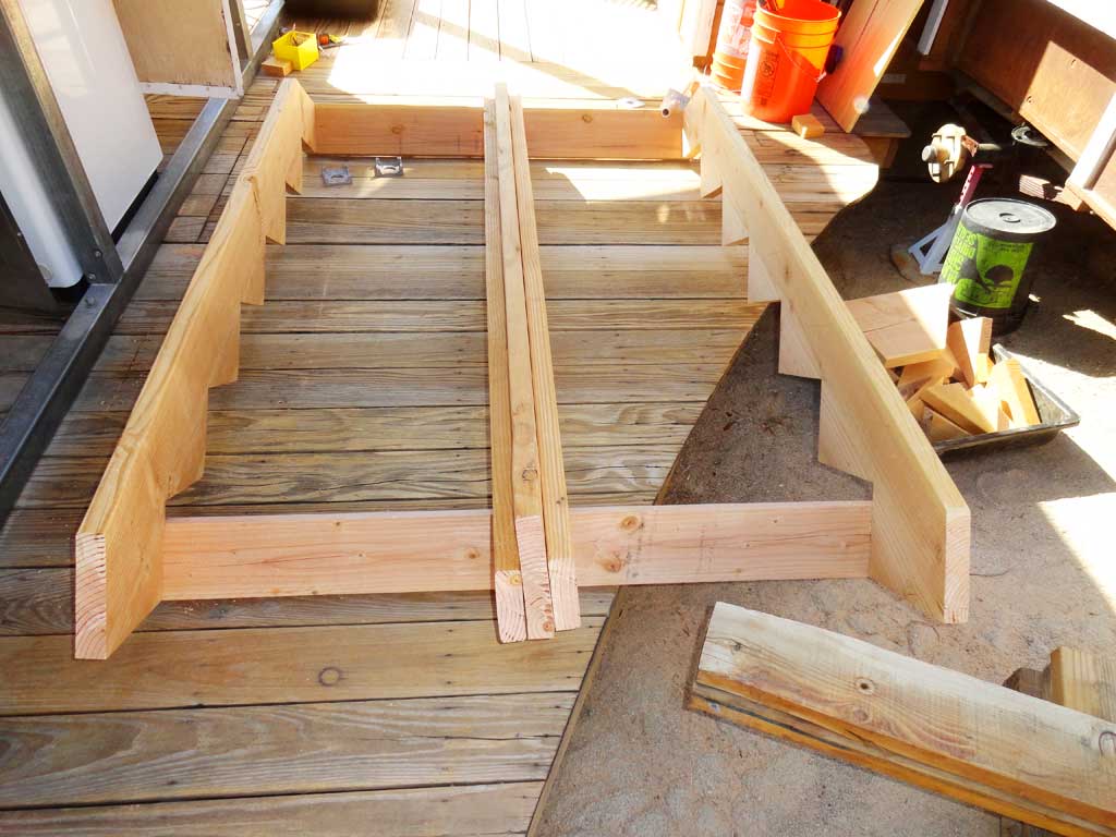 Stringers loosely assembled into the shed platform steps