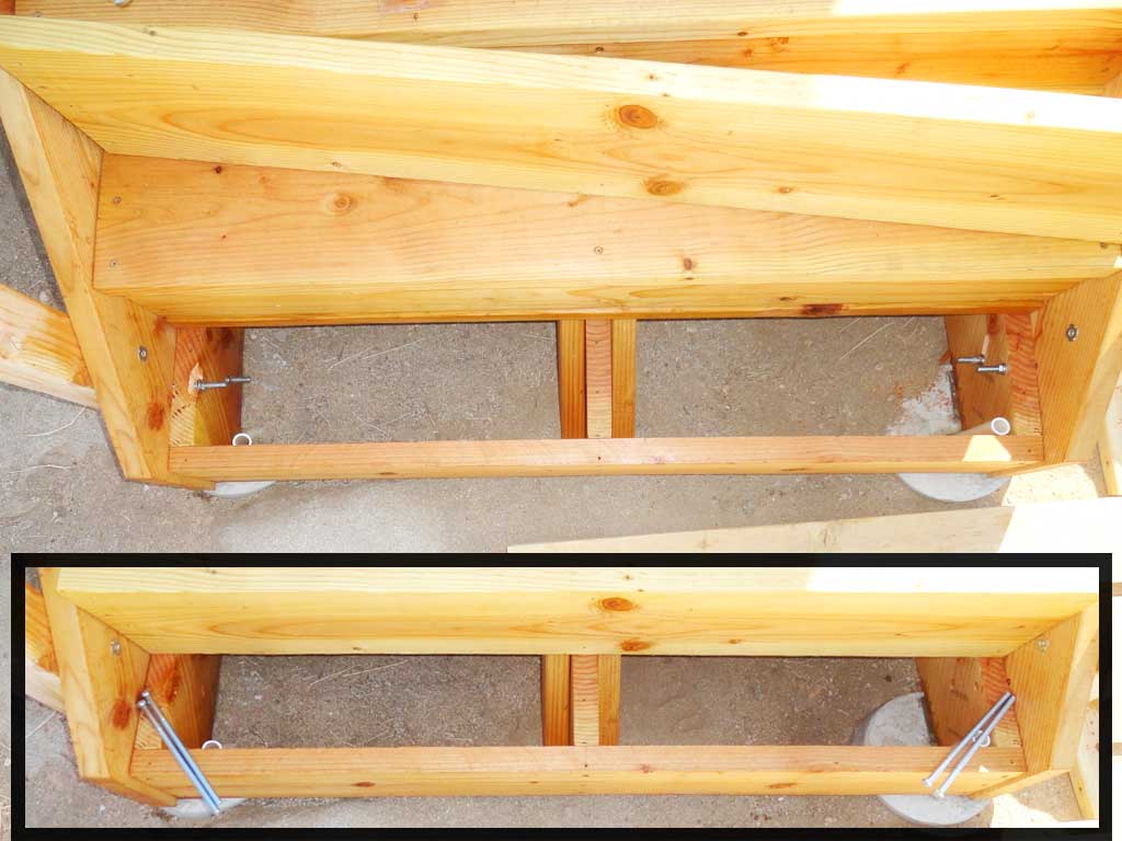 Bolting each post through skirts and stringers with 8 inch bolts