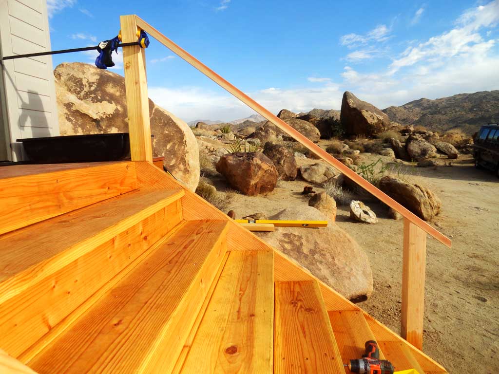 Clamping the 2nd shed platform staircase railing into place before drilling the holes -