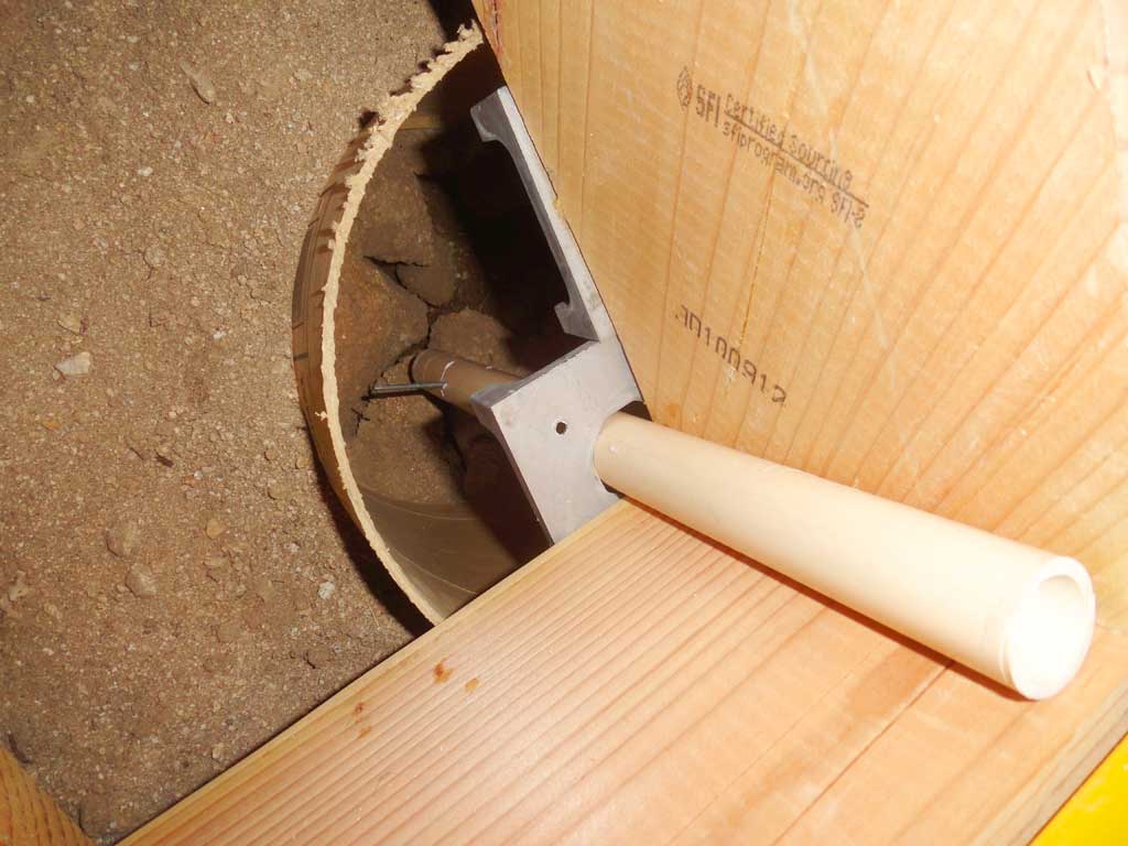 An aluminum post base and its PVC anchor inside a Sonotube prior to pouring the concrete