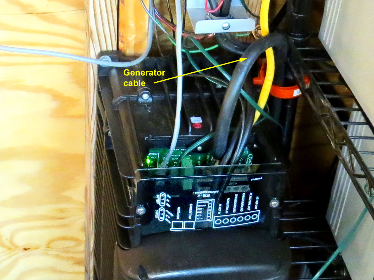 A generator cable leads from the Outback VFX3648 outdoors
