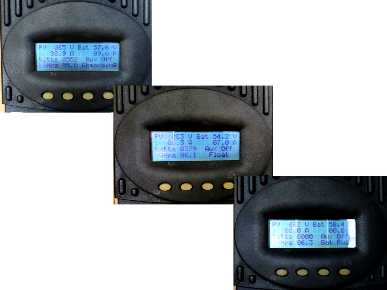 Three MX60 solar controller readings: Absorbing, Float and Bat Full