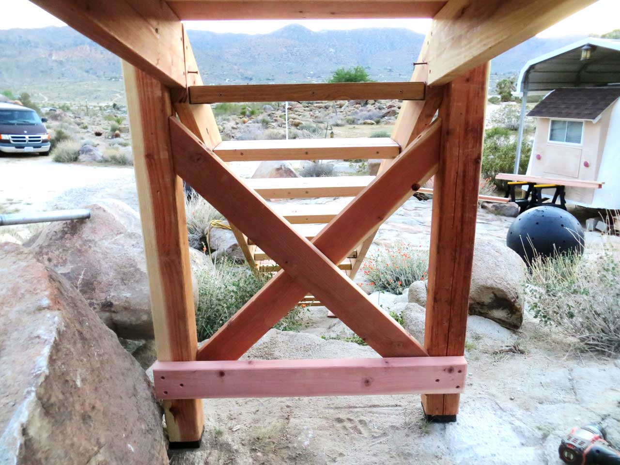 Cross-bracing this post pair to lock in the first staircase on this hillside