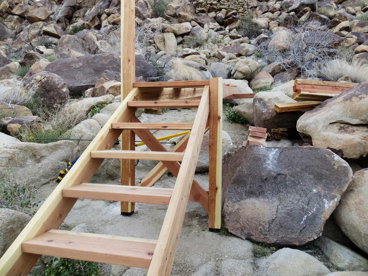 Only one of each post pair will carry a railing on this hillside staircase so cutting the other post to the level of the ramp decking