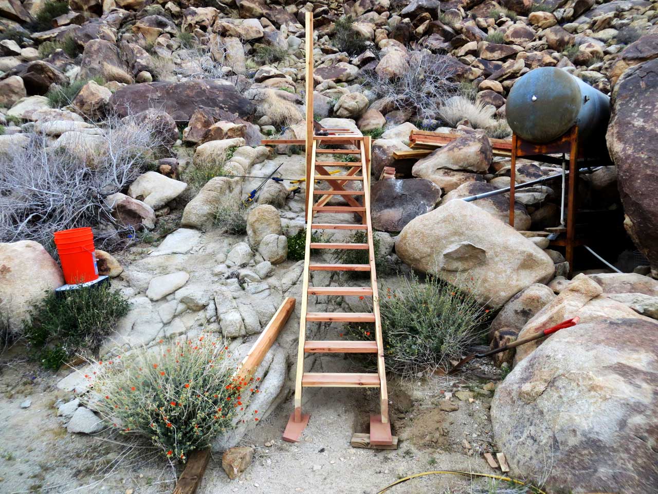 Only one post will carry a railing on this hillside staircase so cutting the other post to the level of the ramp decking