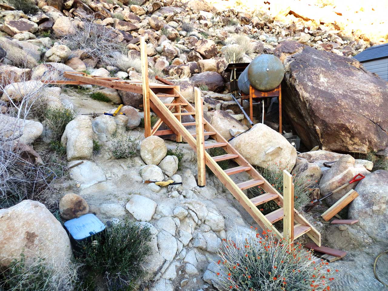 Installing the center railing post on the stairway