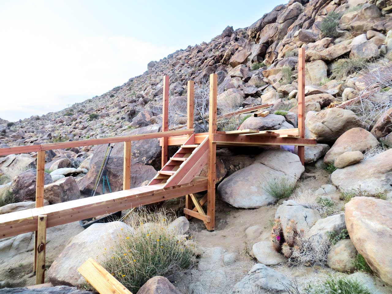 Fitting steps and supports into a short hillside staircase between a ramp and a deck