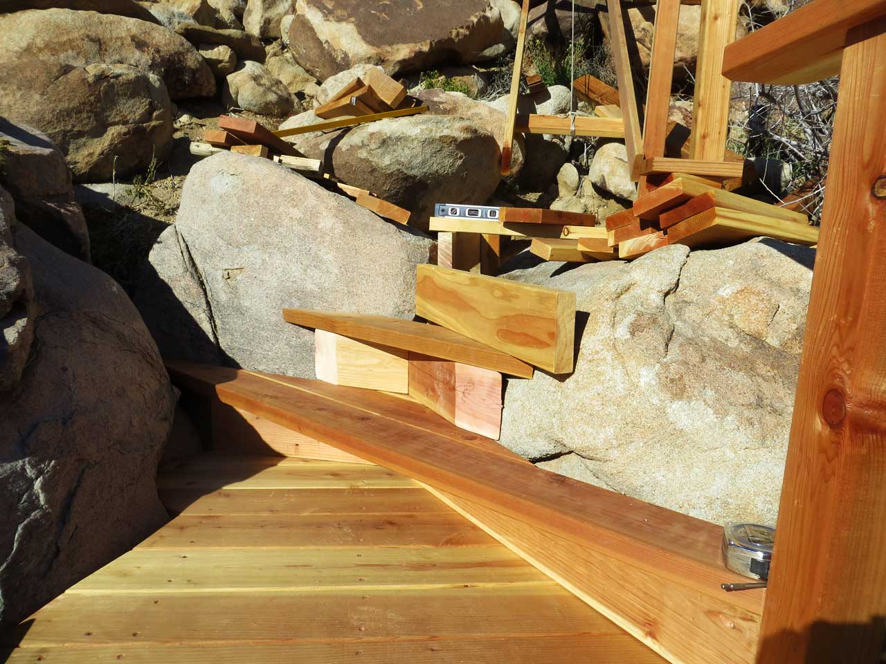 Installing form-fitting steps to turn 90 degrees as it rises from the hillside deck