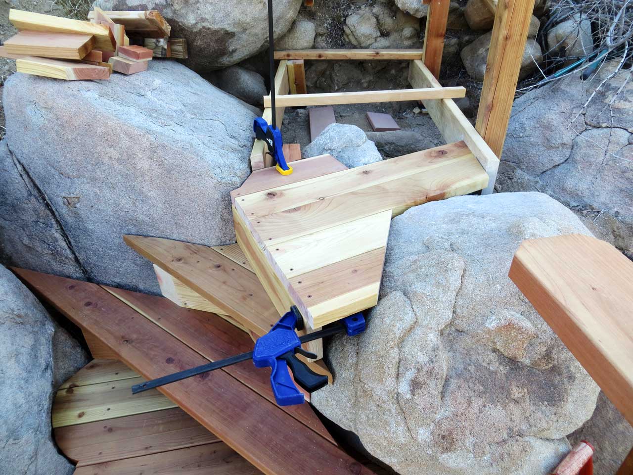 Framing the top step of short hillside staircase to fit between bedrock boulders