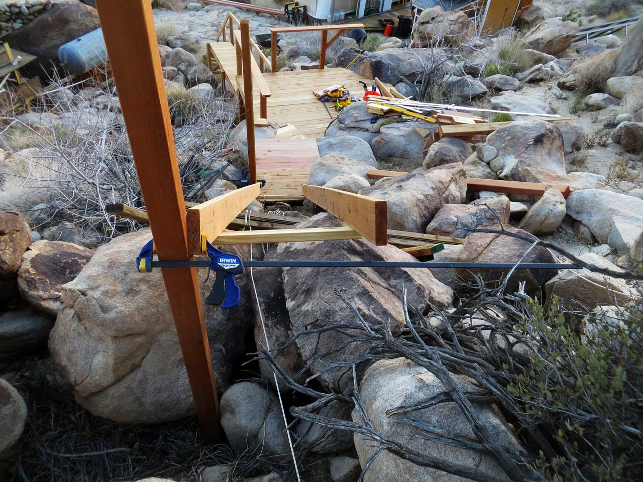 Positioning a top post solidly behind a boulder to lock in this hillside staircase