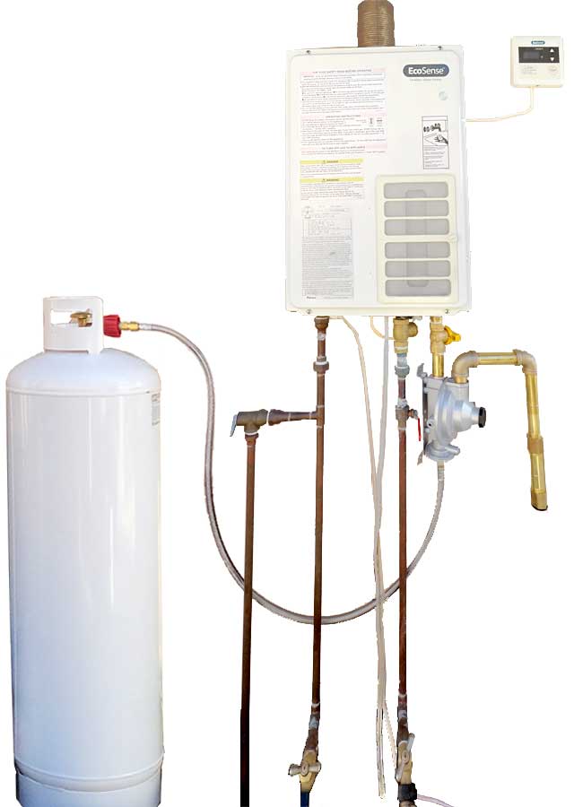 2012: Our original Rheem PTG2-42PVP tankless water heater, a 100 gallon propane tank and an extra large regulator