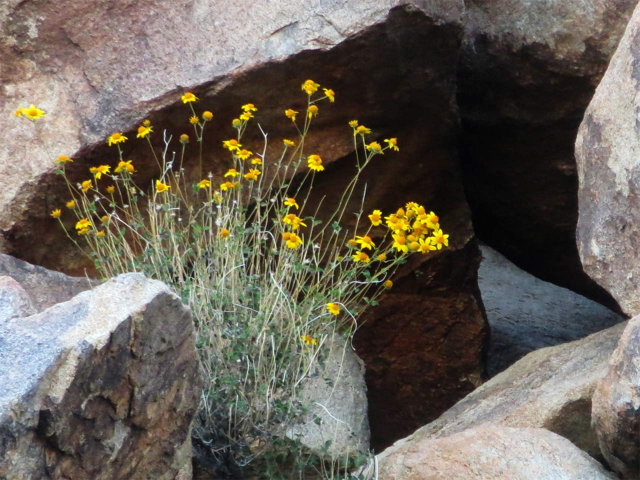 Brittlebush Flowers Nestled Between Boulders