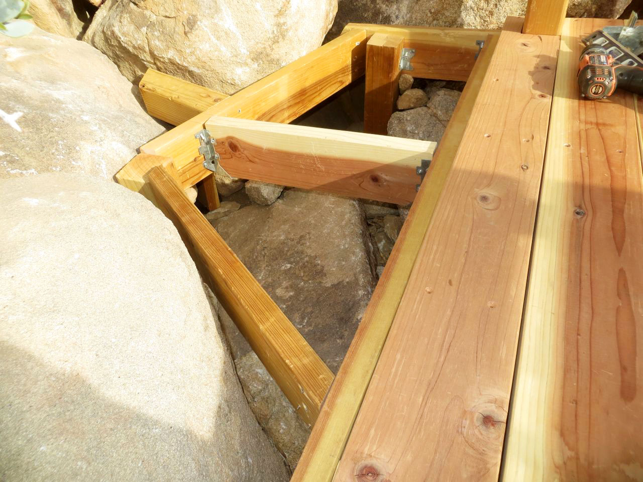 Framing hillside deck extension to fit rocks and to anchor rear of deck