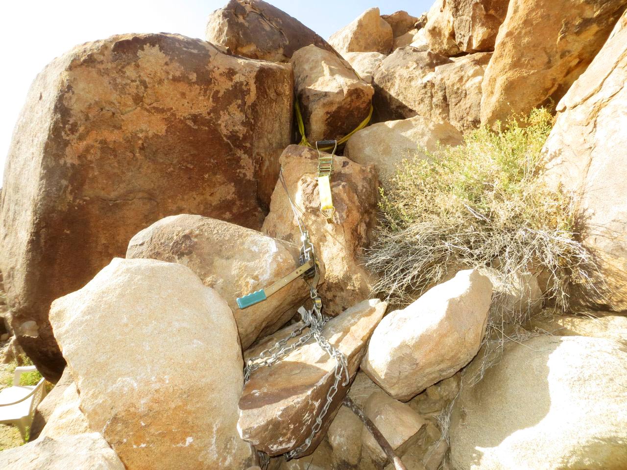 Lifting rocks with a come-along, vinyl strap and a chain