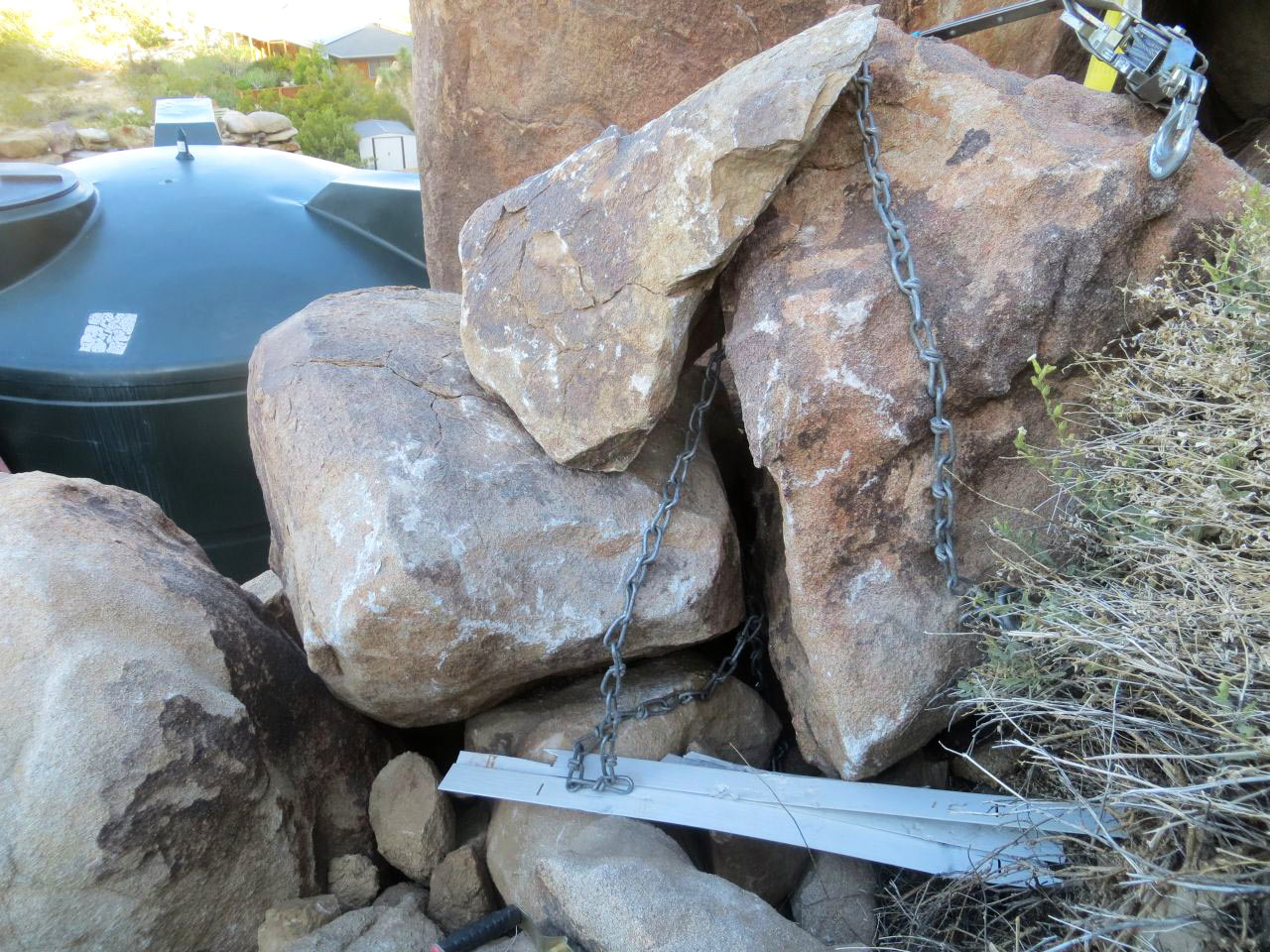 Lifting rocks with pry-bars, a come-along, vinyl strap and a chain