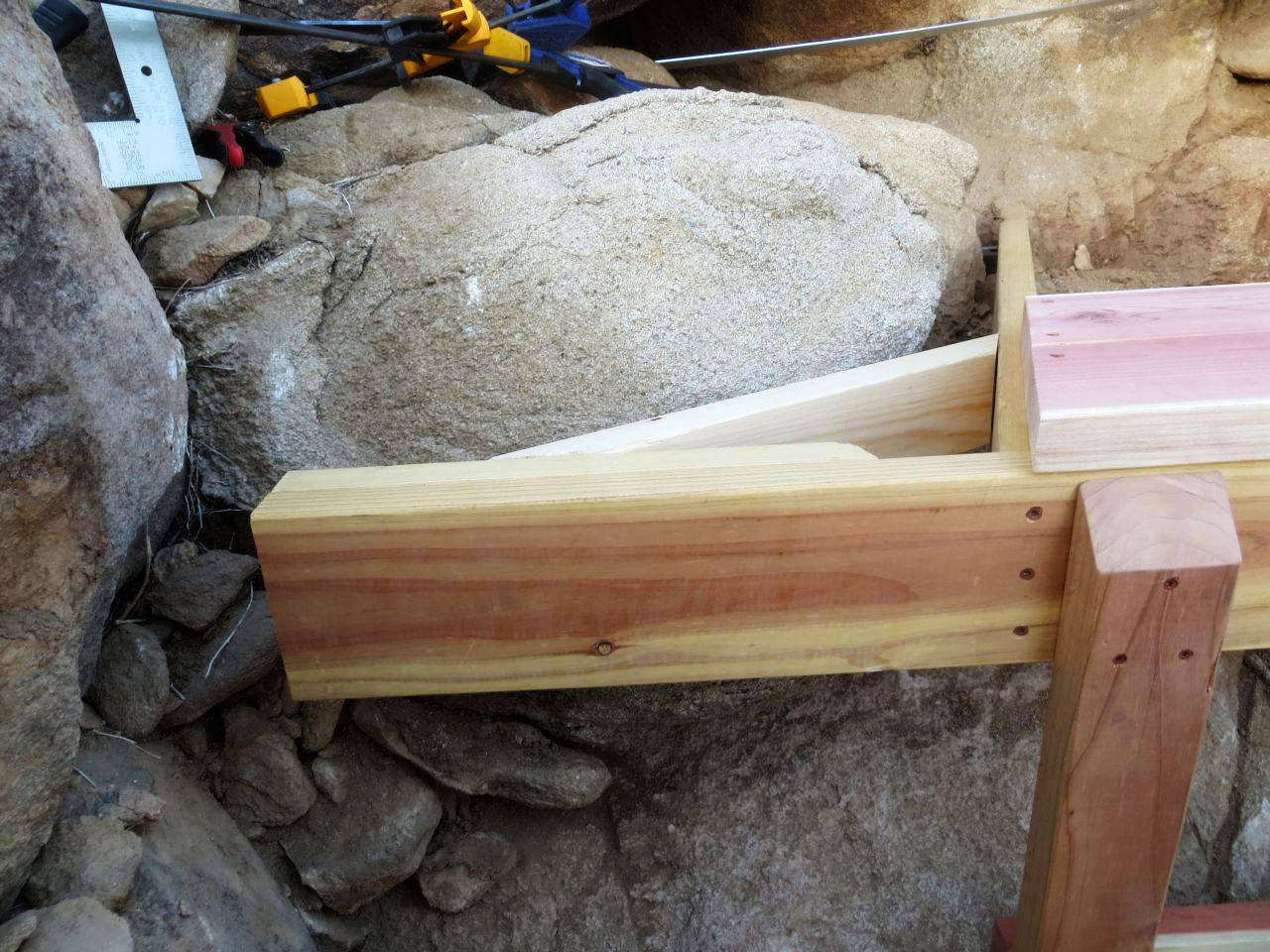 Hillside deck framing around rocks