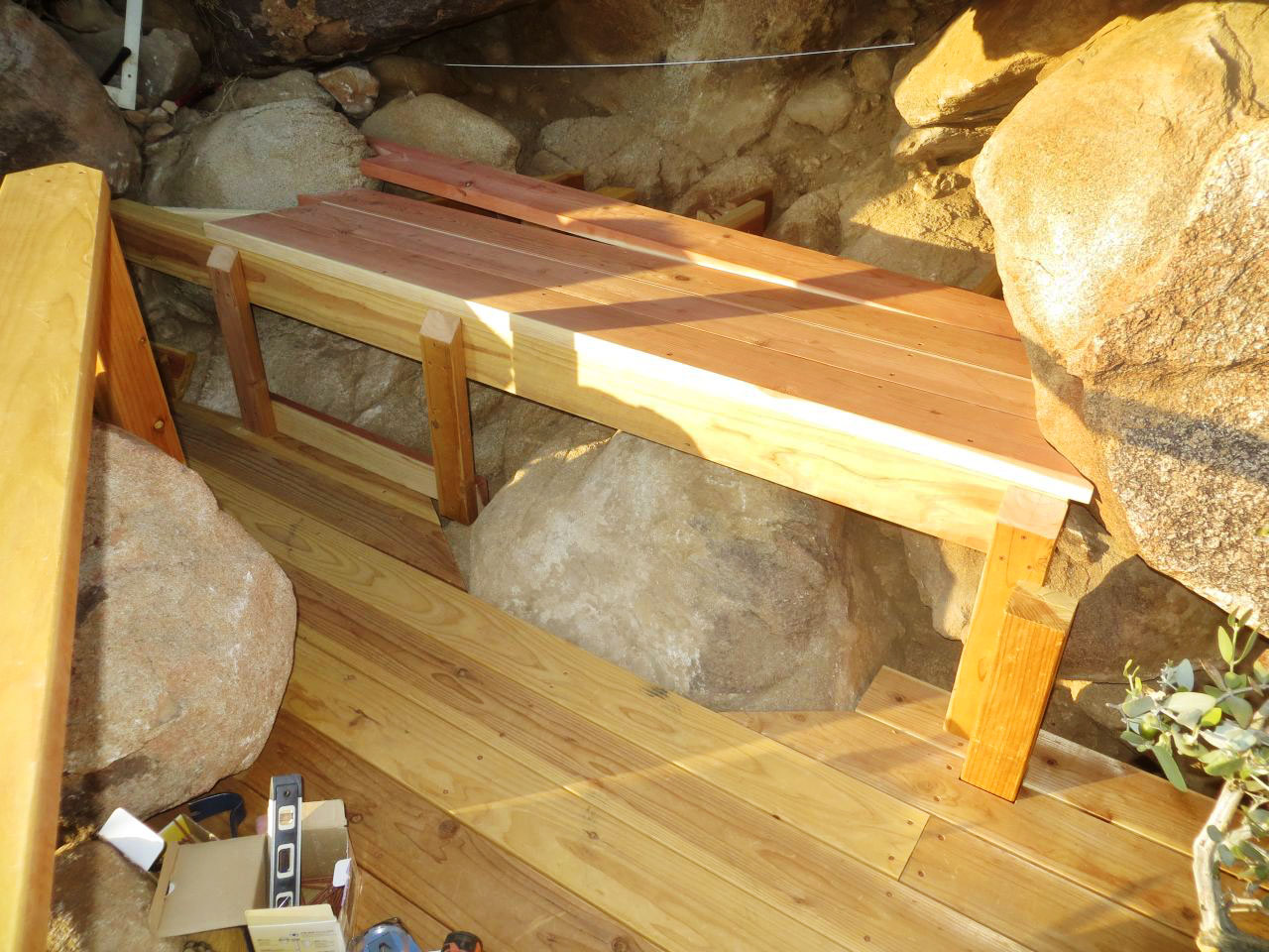 Shaping hillside deck bench to fit between the rocks