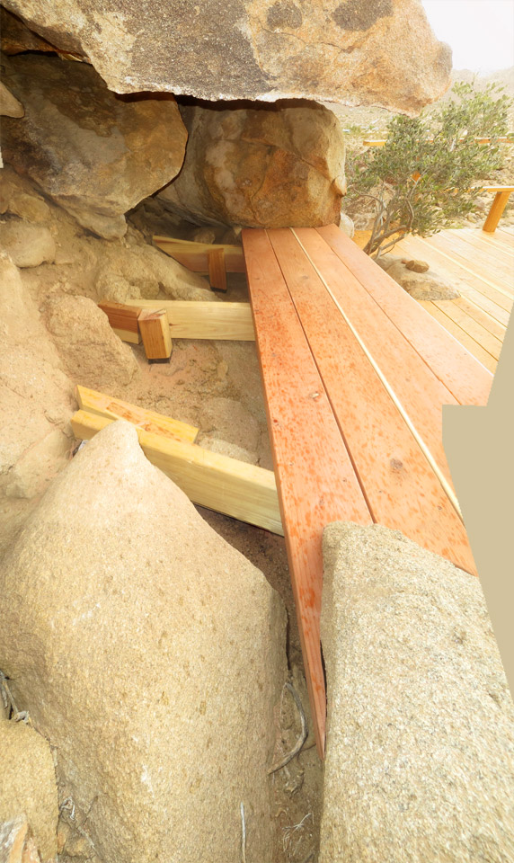 Shaping hillside deck bench to fit between the rocks