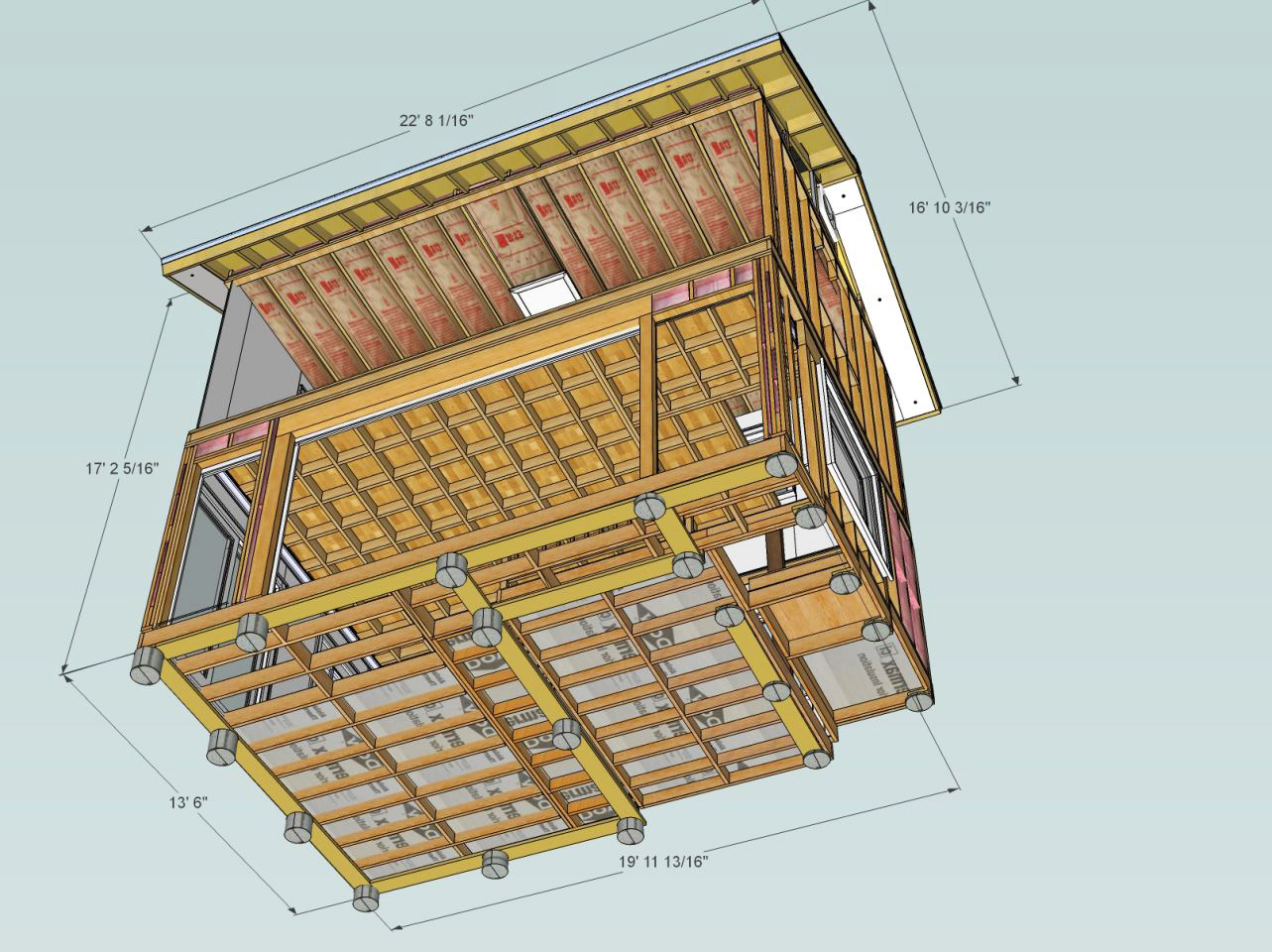 SketchUp modeling two story addition, framed SE corner foundation sills, with dimensions