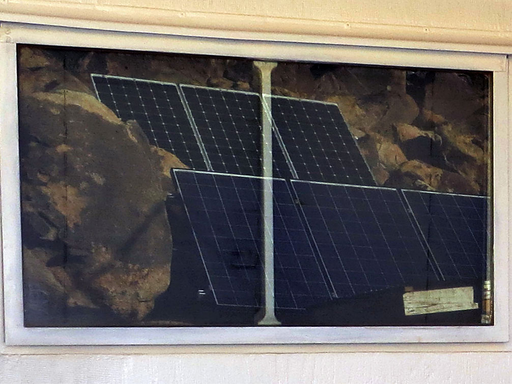 Window reflection of our hillside solar panels and boulders