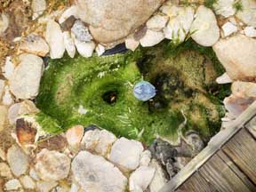 It appears that our water tank up on the hill had probably been emptied by the submerged tree pump on Wednesday at about the same time that we were flying out of Boston. This is surmised because the collapsed blanket of algae in the pond was still wet underneath.