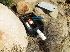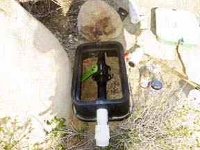 He normally does Joshua Tree on Tuesdays and Thursdays (I think) so he was going out of his way to bring us water. Opening the 1.5" white PVC ball valve at the bottom end of the 70 foot black ABS water line, the plastic handles broke off and gashed his hand. He departed rather quickly. Hence, no water.