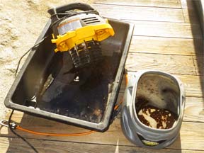 Eventually I decided to buy and use a wet-dry shop vacuum dedicated to this purpose. That is easier and cleaner to use – and it helps remove anything that might be blocking the rear drains. However, I did find that it would be wise to place it into a black plastic basin with a rubber mat draped over the vacuum's outlet to send the mist and drips down into said basin.