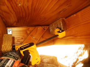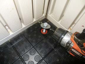 Inside there is a round shallow depression in the plastic floor about 2 inches in from each corner. I drilled a 3/8" hole though the center of each front depression and down through the 3/4 inch plywood and just slightly into the 2x8 beam below that. I then went underneath, found where the drill had cut into the beam leaving a trace of sawdust, and then glued and screwed a block of wood to the beam beside each hole.