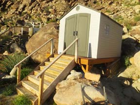 On the Joshua Tree 2012-2013 web site I describe the construction of a solid raised 8' x 12' platform and stairs, under which would eventually go a stone wall, a sound barrier and a generator, with a reasonably sturdy made-in-the-USA 8' x 10' Lifetime shed on top. The platform had a very slight southwest tilt so that it would shed rain rather than letting it settle under the plastic shed and rot the wood.