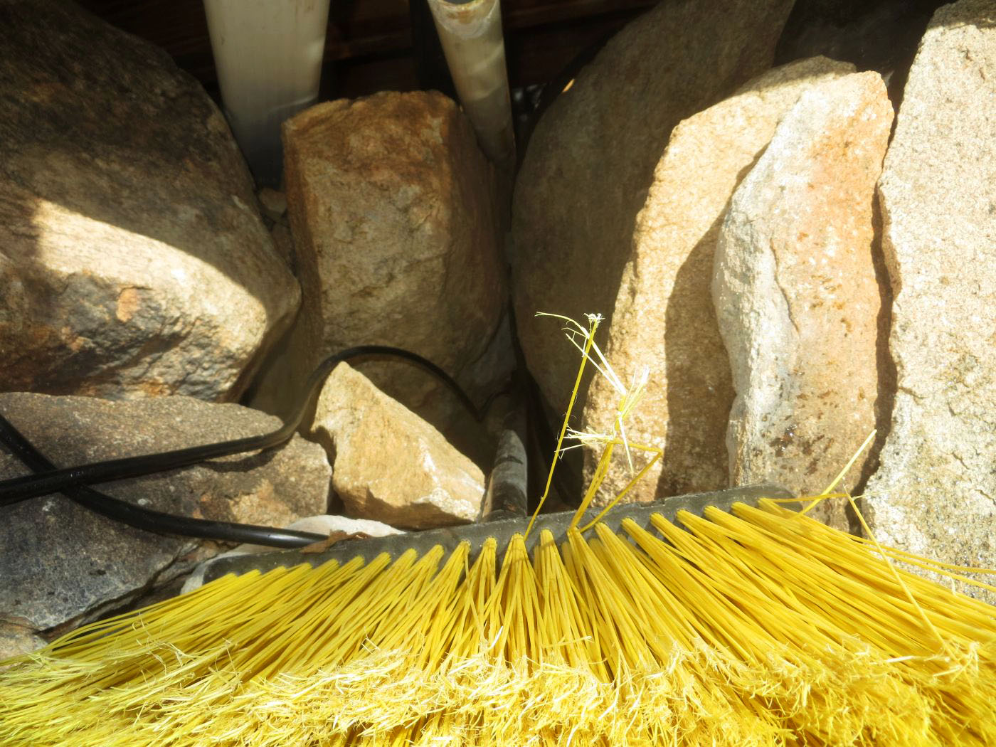 Pushing power cord between rocks with broom handle