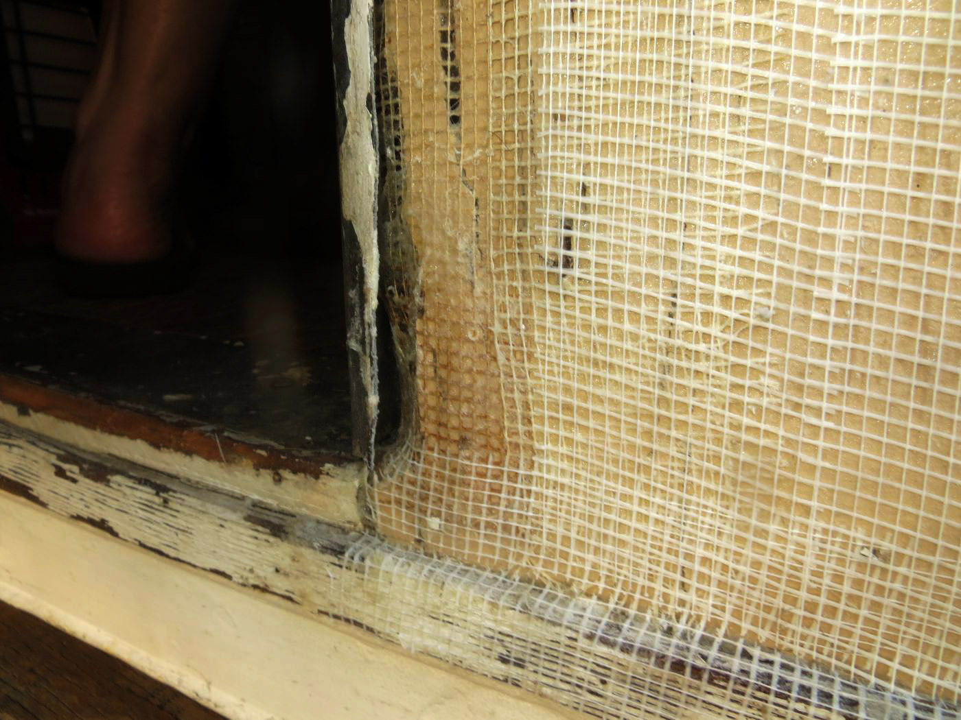 Sprayed fiberglass tape seals bad door jamb corner