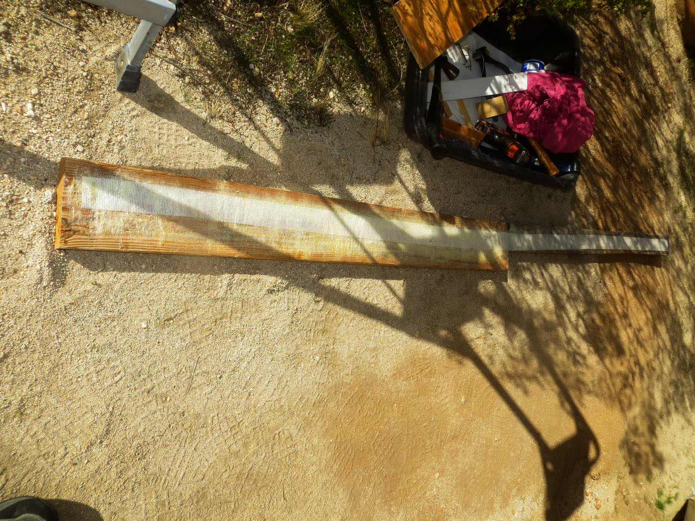 Spraying long fiberglass tape with adhesive on long scrap wood