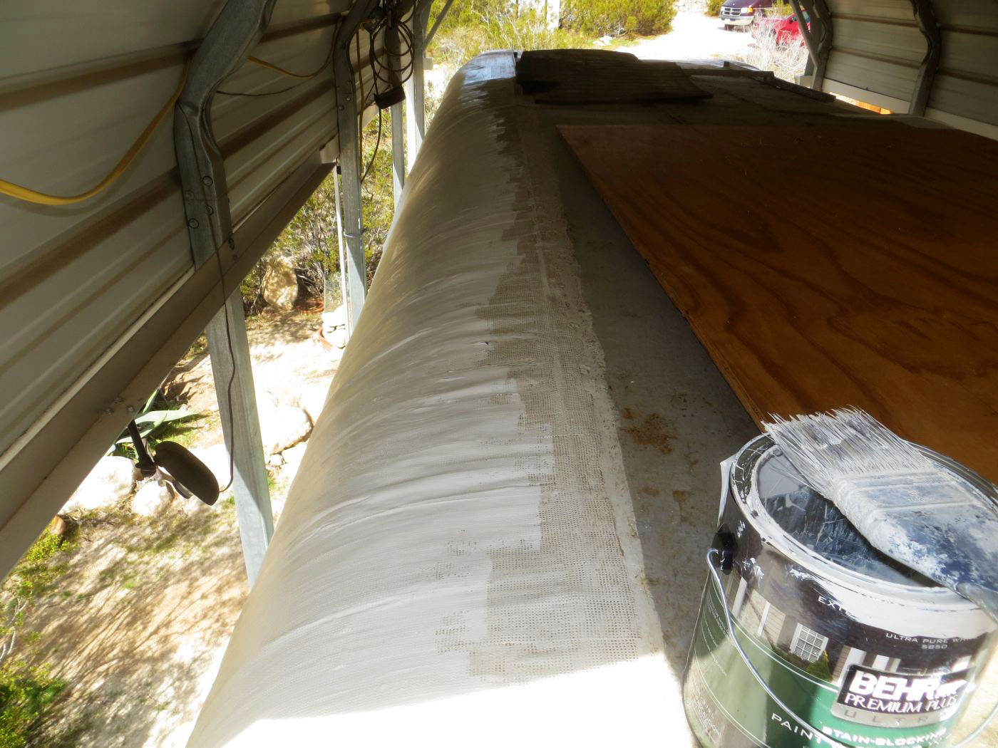 Painting fiberglass taped roof border with Behr 'Swiss Coffee'