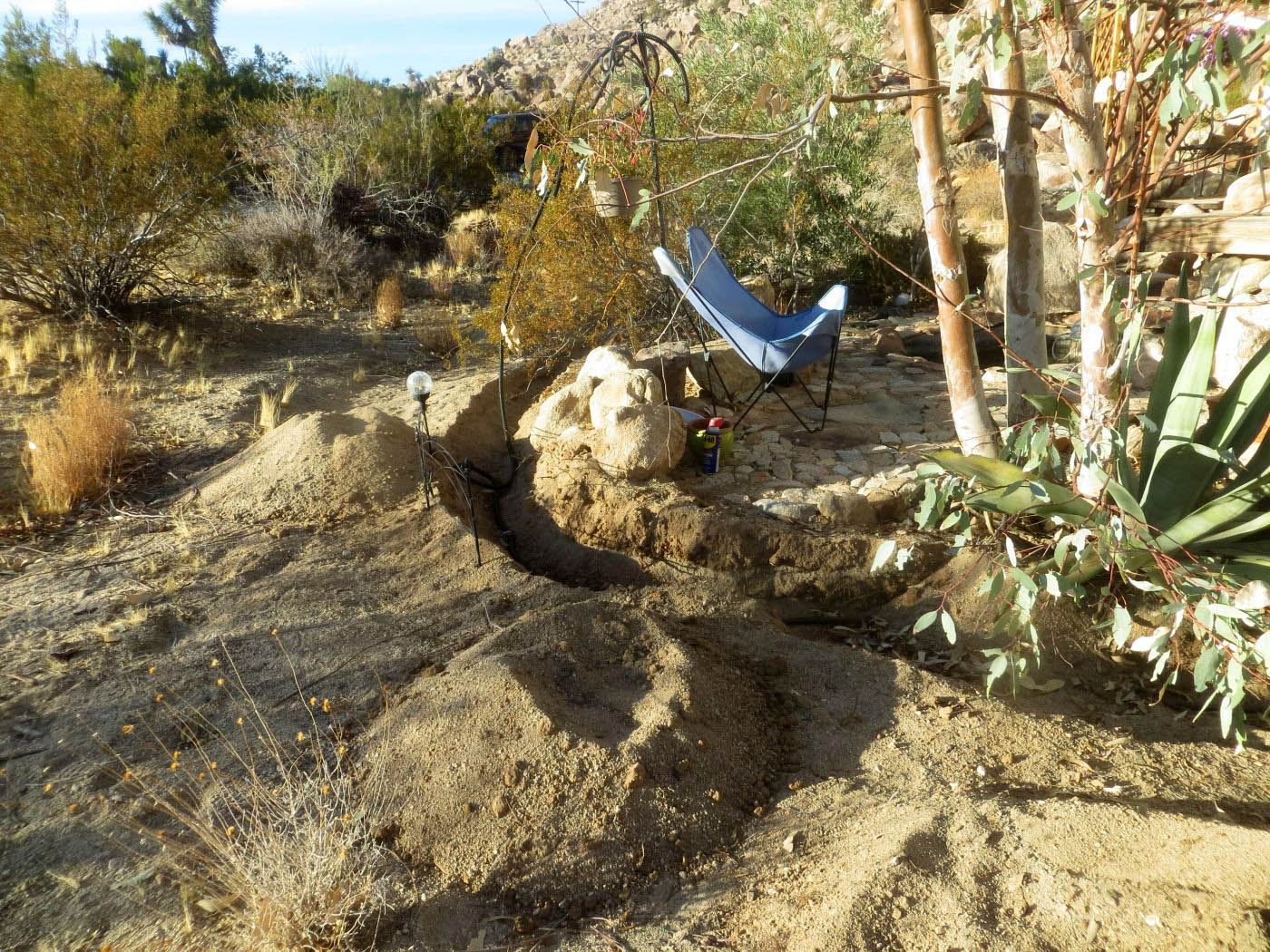 Pond pump hose being passed through trench