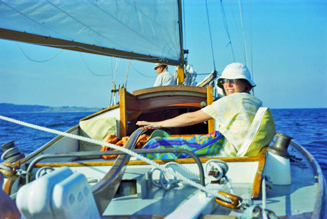 Deb Blakeman sailing Win Kellogg's boat, the Kittiwake