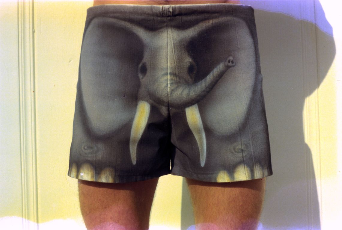 Birthday gift of Elephant bathing shorts probably from my sister Hannah