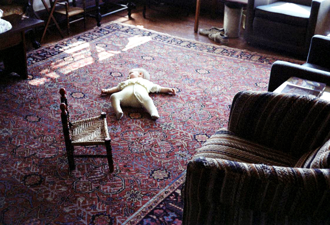Brianny Blakeman asleep on a Persian rug at her paternal grandparent's home