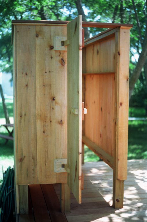 The experimantal hinges and latch of the shower stall were hand made by Van