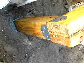 |  Preparing to pour concrete footing |  Footing for trailer cradle support |  Post anchored to footing | |